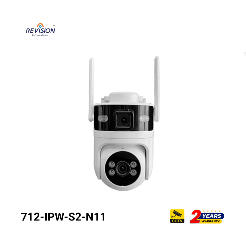 دوربین مداربسته WIFI ریویژن مدل 743-IPW-S2-N11 با کیفیت 2 مگاپیکسل، سه لنز (دو لنز ثابت و یک لنز چرخشی)، دید در شب رنگی، تشخیص و ردیابی انسان، ذخیره‌سازی ابری و کارت حافظه microSD تا 256GB، و مقاوم در برابر آب و گرد و غبار (IP66).